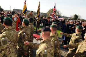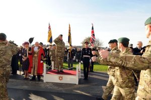 HRH The Duke of Edinburgh visited Barnstaple on 17th November to take the salute at the homecoming parade of the men and women from Commando Logistic Regiment, Chivenor Barracks, having returned from their six months in Afghanistan. The troops were led through the streets by the Band of Her Majesty’s Royal Marines. The crowd was boosted by 1000 plus, families and friends, who travelled from all over the UK. On return to the Barracks the Duke of Edinburgh presented troops with various medals, including the Operational Service Medal.