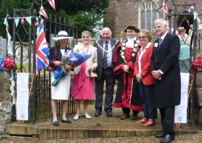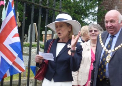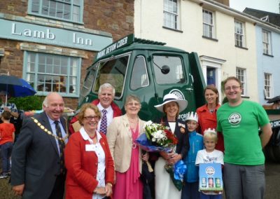 Sandford’s celebrations to mark the 90th birthday of HM The Queen, got off to a great start with the Sandford Royal Street Market in and around Church Street.  As the weather was unhelpful the organisers, much like the EU Referendum, had to make up their minds IN (inside the Parish Hall) or OUT (outside).  In the end the OUT majority won and it was a showery day. The sun did shine in time for the Opening of the Street Market by Deputy Lieutenant of Devon, the Honourable Mrs Elizabeth d’Erlanger who praised Sandford for planning such a great weekend. She was introduced by the Crediton Town Crier Kevin Payne.  The Chairman of Mid Devon District Council Cllr John Daw and Mrs Daw were also in attendance.  There were many stalls and the highlight was a Fairground Organ playing in the Square and the first appearance of the Sandford Orchards Lorry ‘Old Garge’ introduced by Barney Butterfield. Saturday evening saw a Family Ceilidh and on Sunday a celebration service at St Swithins followed by a Bring and Share Lunch at Sandford Parish Hall. The celebrations ended with a Loyal Toast by Barney Butterfield in Sandford Orchards Cider specially brewed for the occasion.