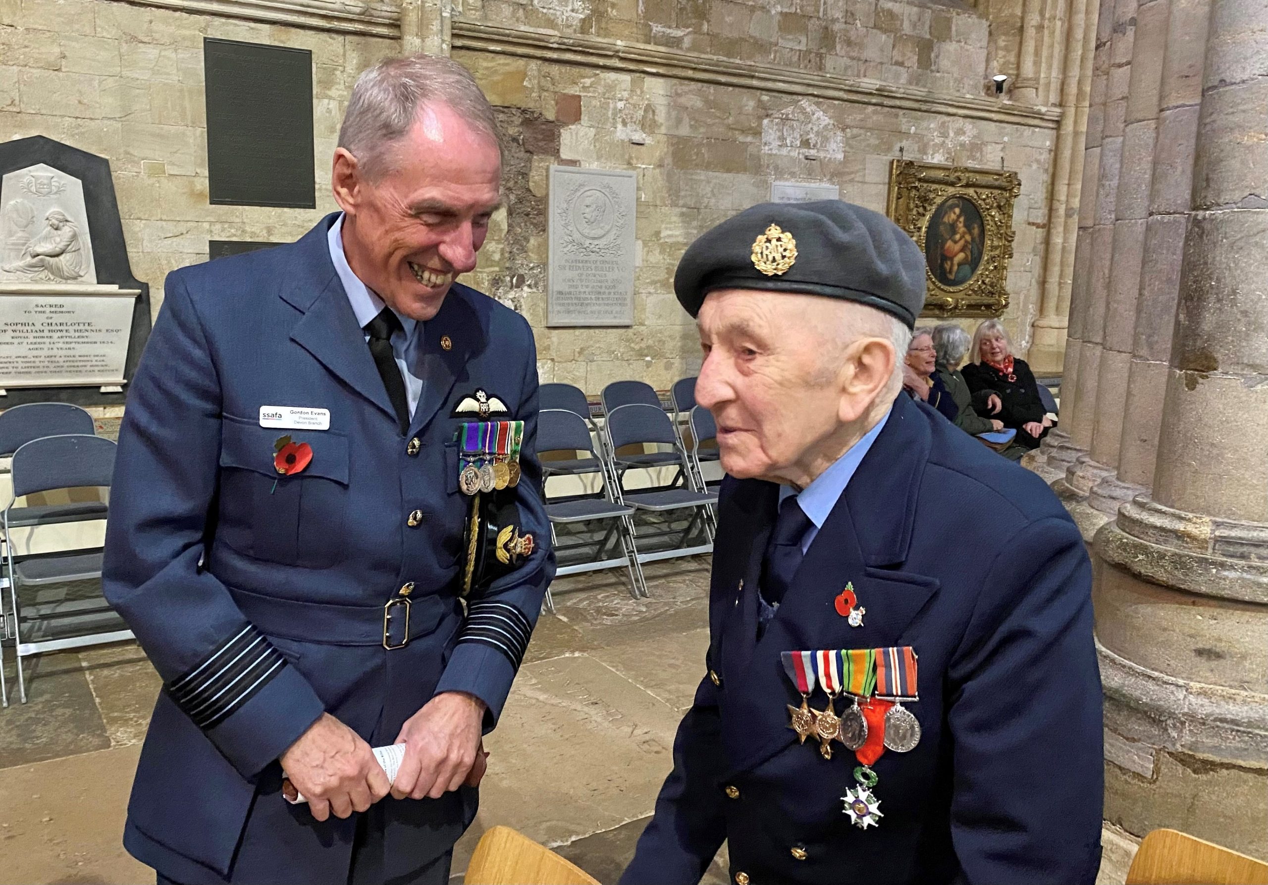 There was one very special guest, Mr Joseph Randall from Teignmouth. Joseph served as a Corporal in the Royal Air Force constructing advanced landing grounds with 5022 Squadron Airfield Construction Branch at D Day. He was just 20 years old when he hit the beach. In August this year, he reached 100 years of age. He received a standing ovation from the crowd and went on to meet Group Captain Gordon Evans DL. Full of life and character, Joseph quipped that he had never been hugged by a Group Captain before.